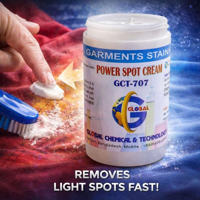 Power Spot Cream (GCT-707) is a specialized spot removing cream designed for garments factories to eliminate light stains, dust marks, and surface spots quickly and safely. This cream-based formula is extremely effective yet gentle on hands and fabric, making it ideal for regular spot-removing operations in industrial environments.